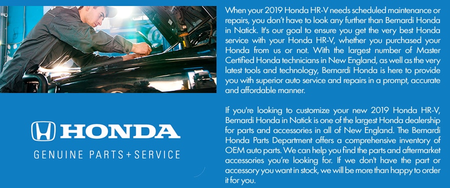 Experience the many features of the new 2019 Honda HR-V for yourself at Bernardi Honda in Natick today. Bernardi Honda proudly serves the Natick, Framingham, and greater Boston, MA areas. With over 600 vehicles on-hand to choose from, a children's recreation area, free Starbucks coffee and many more amenities, we guarantee you'll enjoy a smooth and effortless car buying experience at Bernardi Honda. We're conveniently located on Route 9 near the Massachusetts Pike and Route 27. Stop by Bernardi Honda today and become part of our growing family. It's Bernardi for Now...Bernardi for Life!
