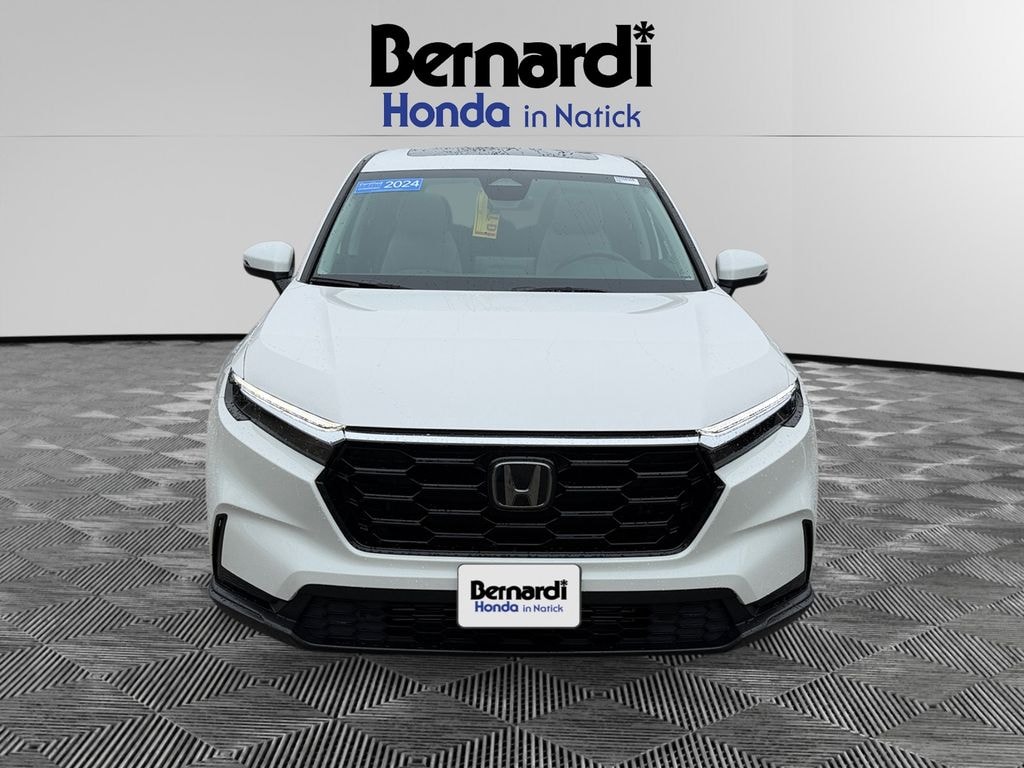 The 2024 Honda CR-V EX also boasts a host of impressive capabilities, including power driver seat, power steering, power windows, remote keyless entry, steering wheel mounted audio controls, auto high-beam headlights, delay-off headlights, fully automatic headlights, panic alarm, security system, and 18" Sparkle Silver Metallic wheels.